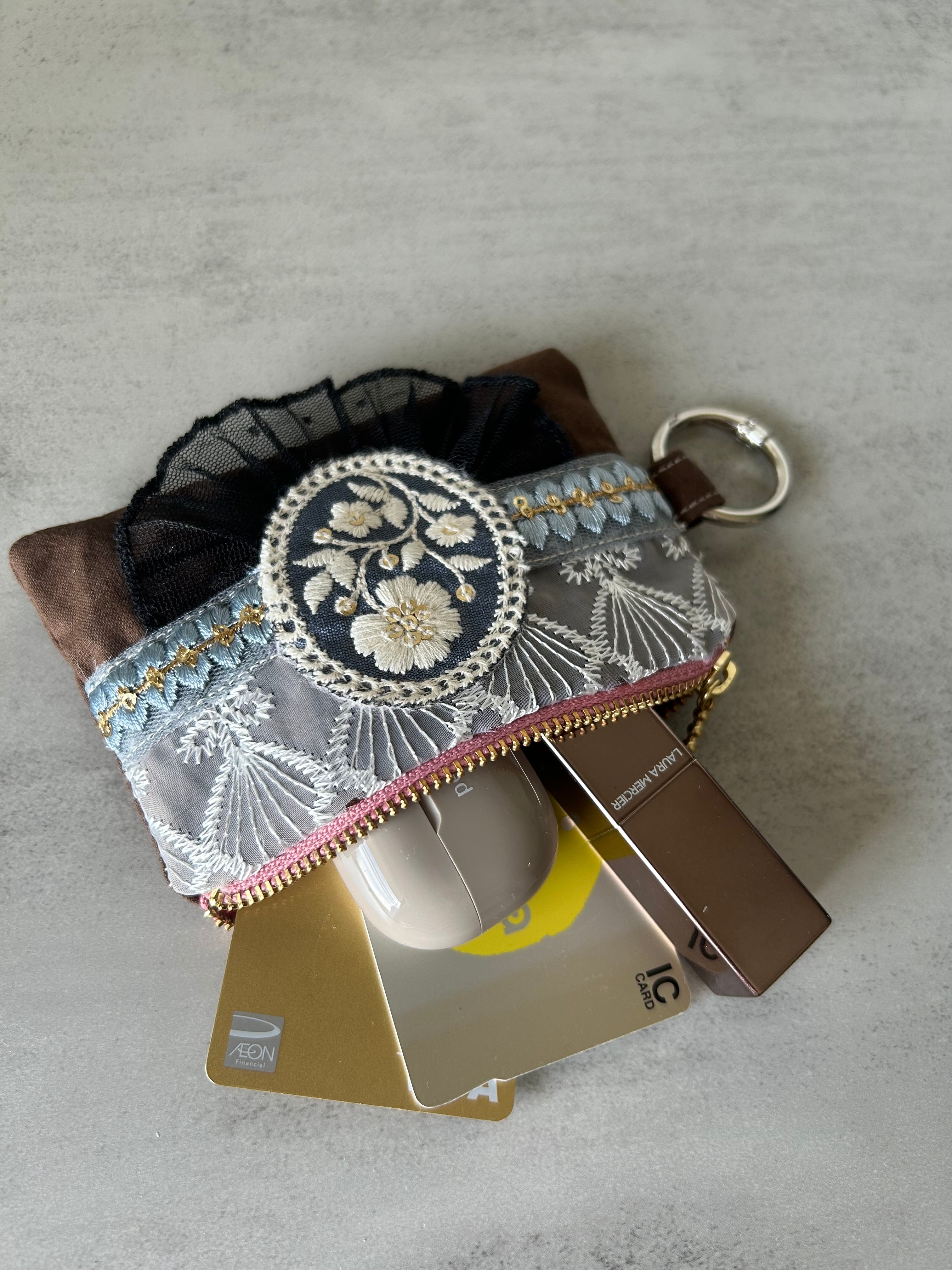 二週間のインド刺繍リボンと2種類のレースを使用した、ファスナーポーチです。カラビナ付きです。