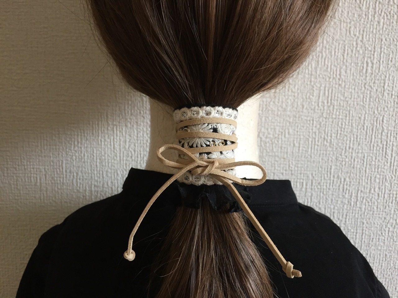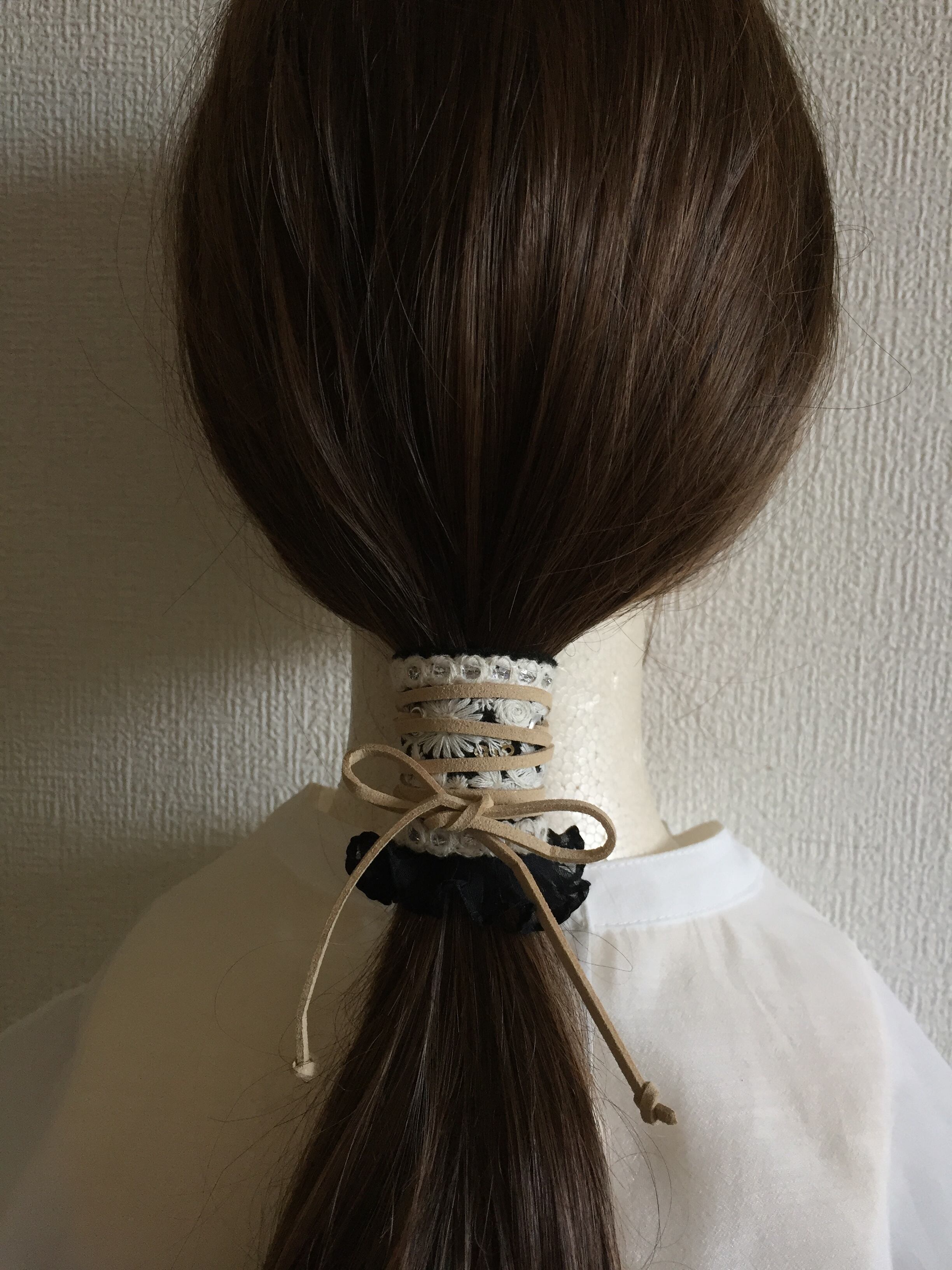 使い方は、お手持ちのヘアゴムで結んだあとにポニーフックを引っかけて紐を結ぶだけです。