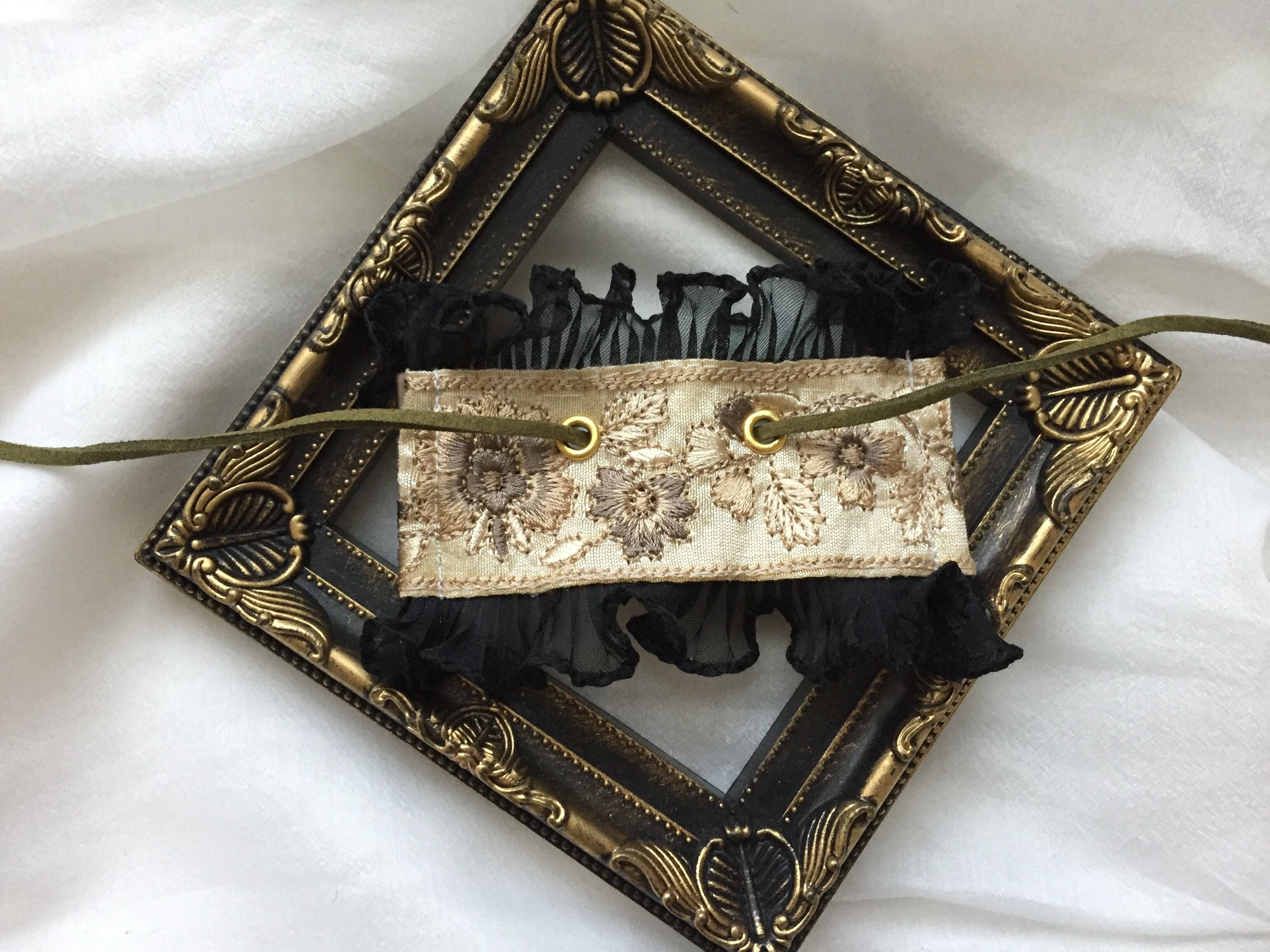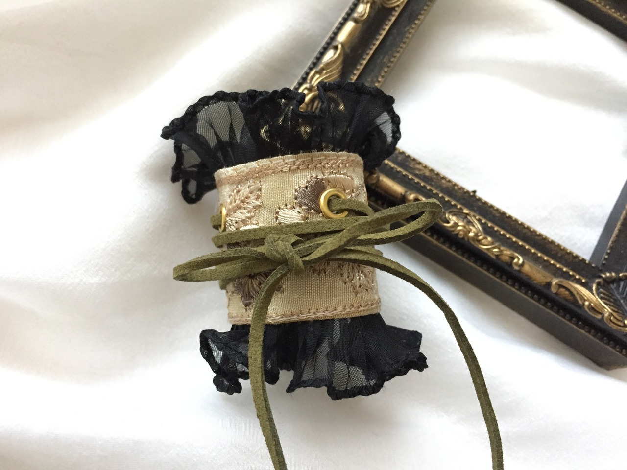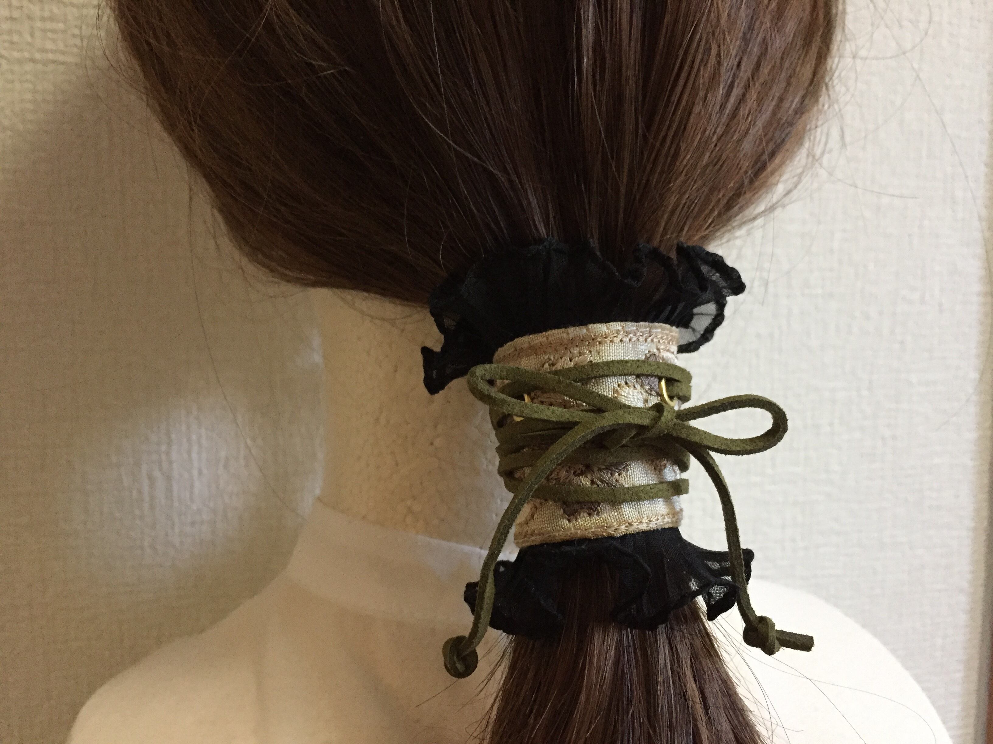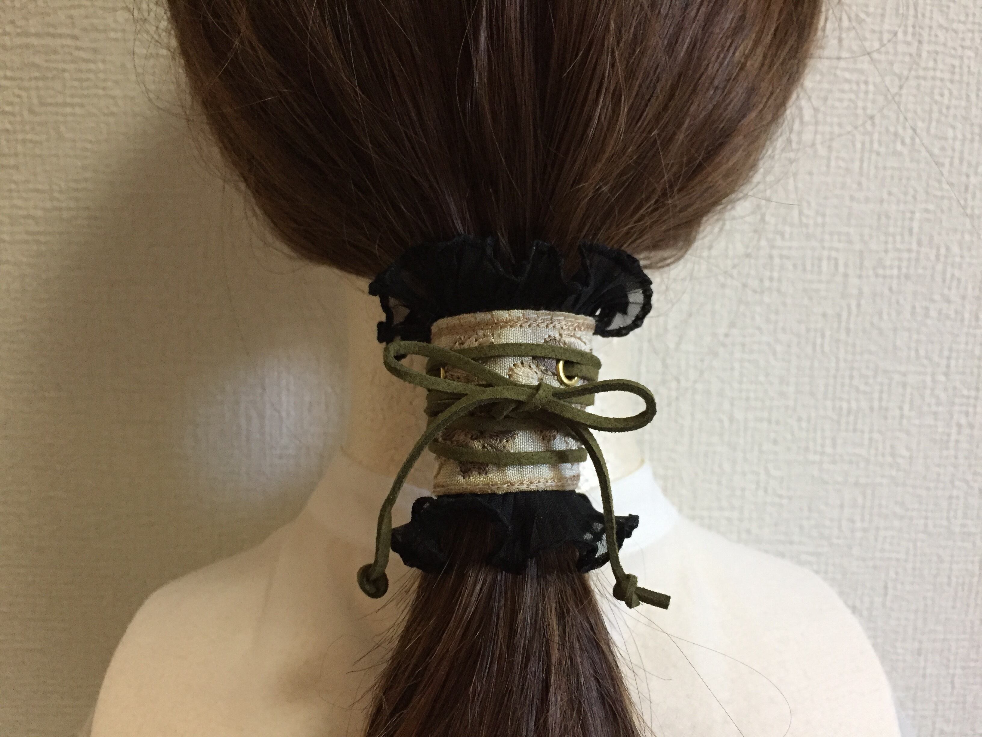インド刺繍リボンを使った、上下にフリルレースをあしらった可愛いラップリボン・ヘアアクセサリーです。