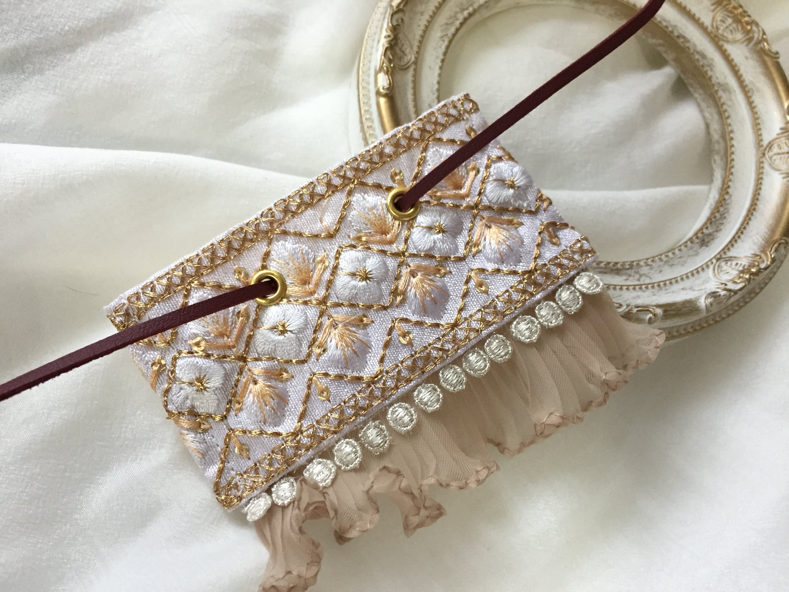 インド刺繍は、手作りで作られております。中には、歪み・ホツレなどがある場合があります。こちらも、そういう所を使わないようにしますので、その点ご理解お願い致します。