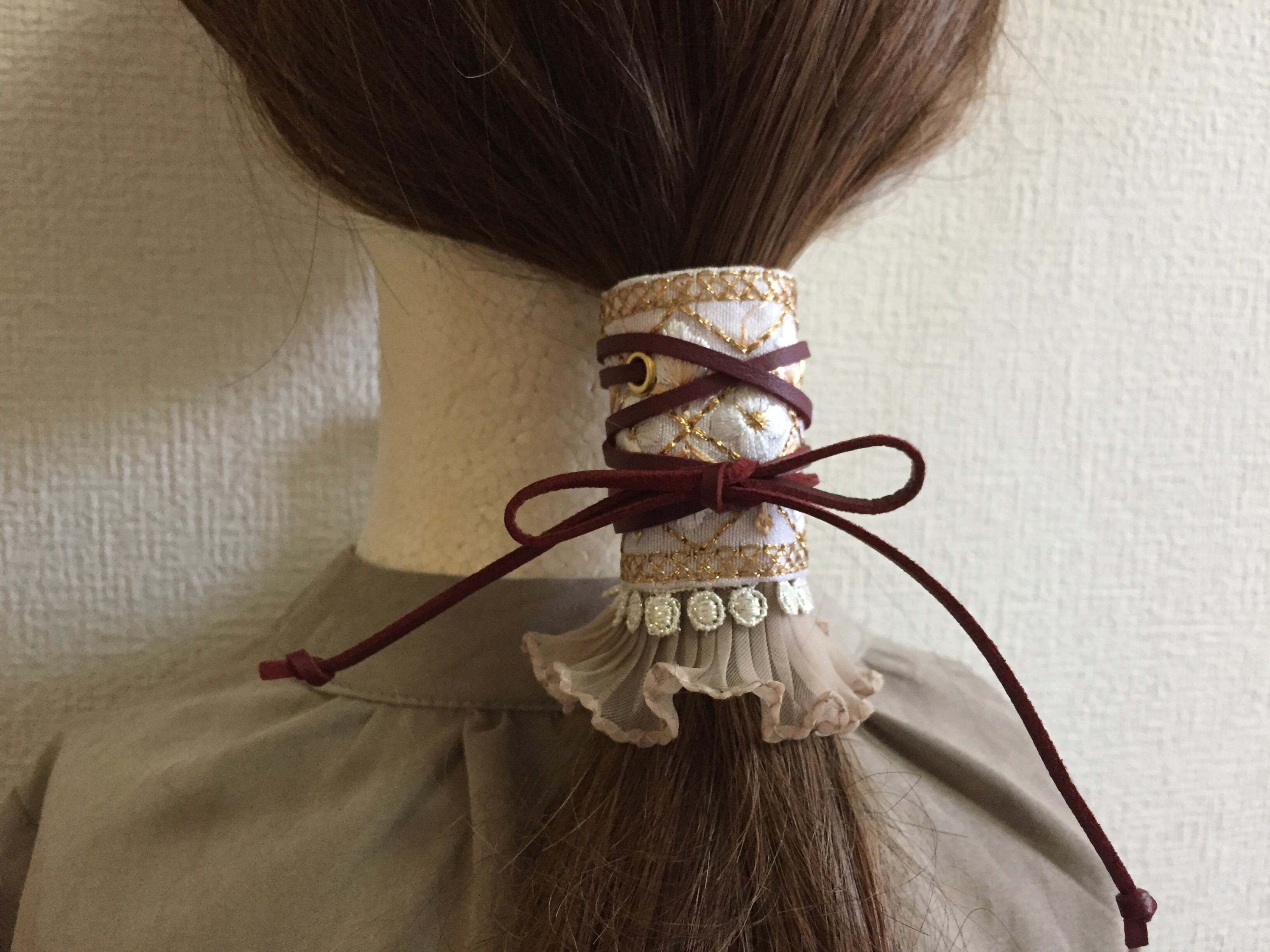 インド刺繍リボンを使ったフリルレースが可愛いラップリボンのヘアアクセサリーです。