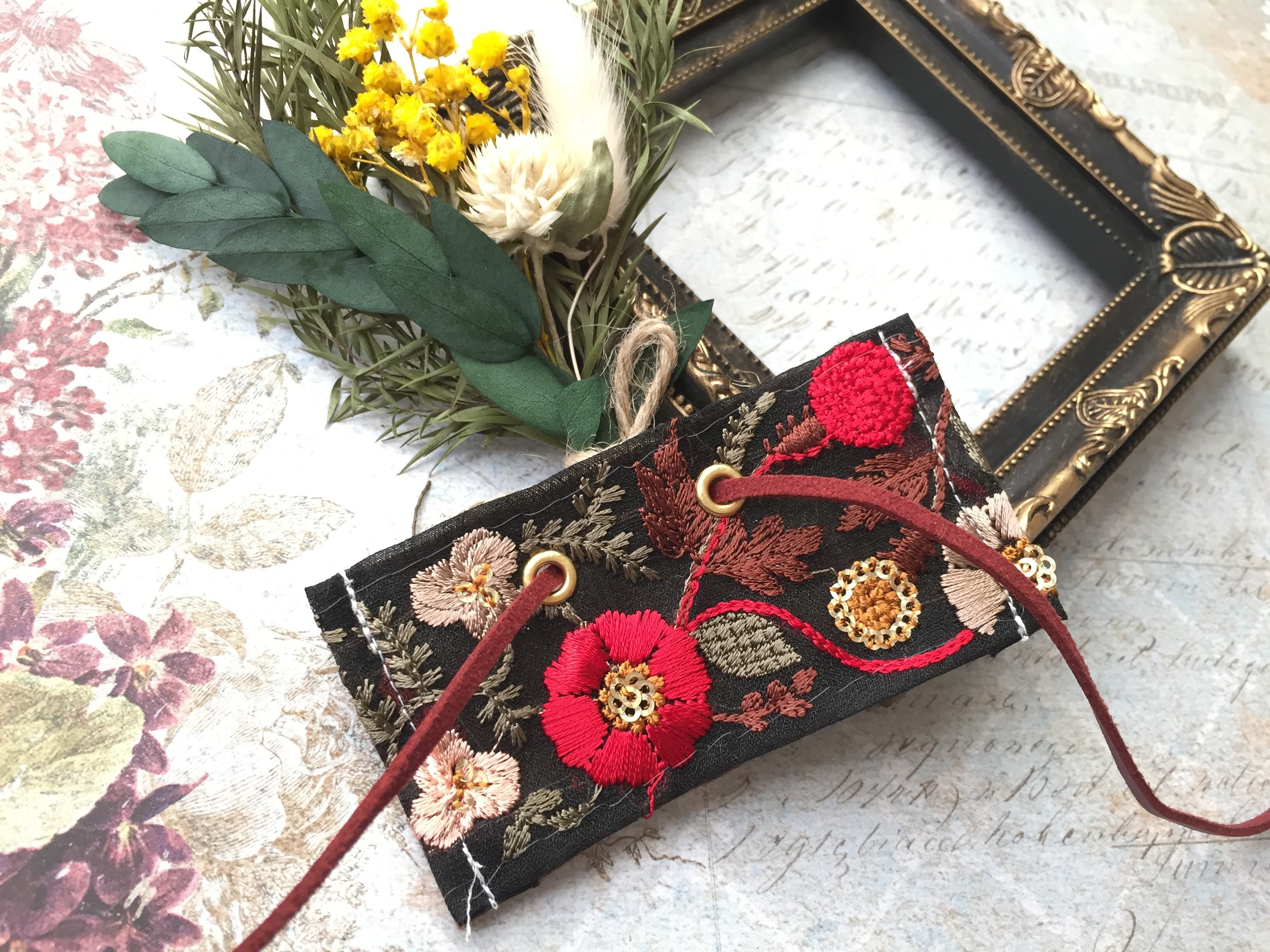 インド刺繍 リボン ポニーフック ラップリボン リボンラップ 黒×花柄