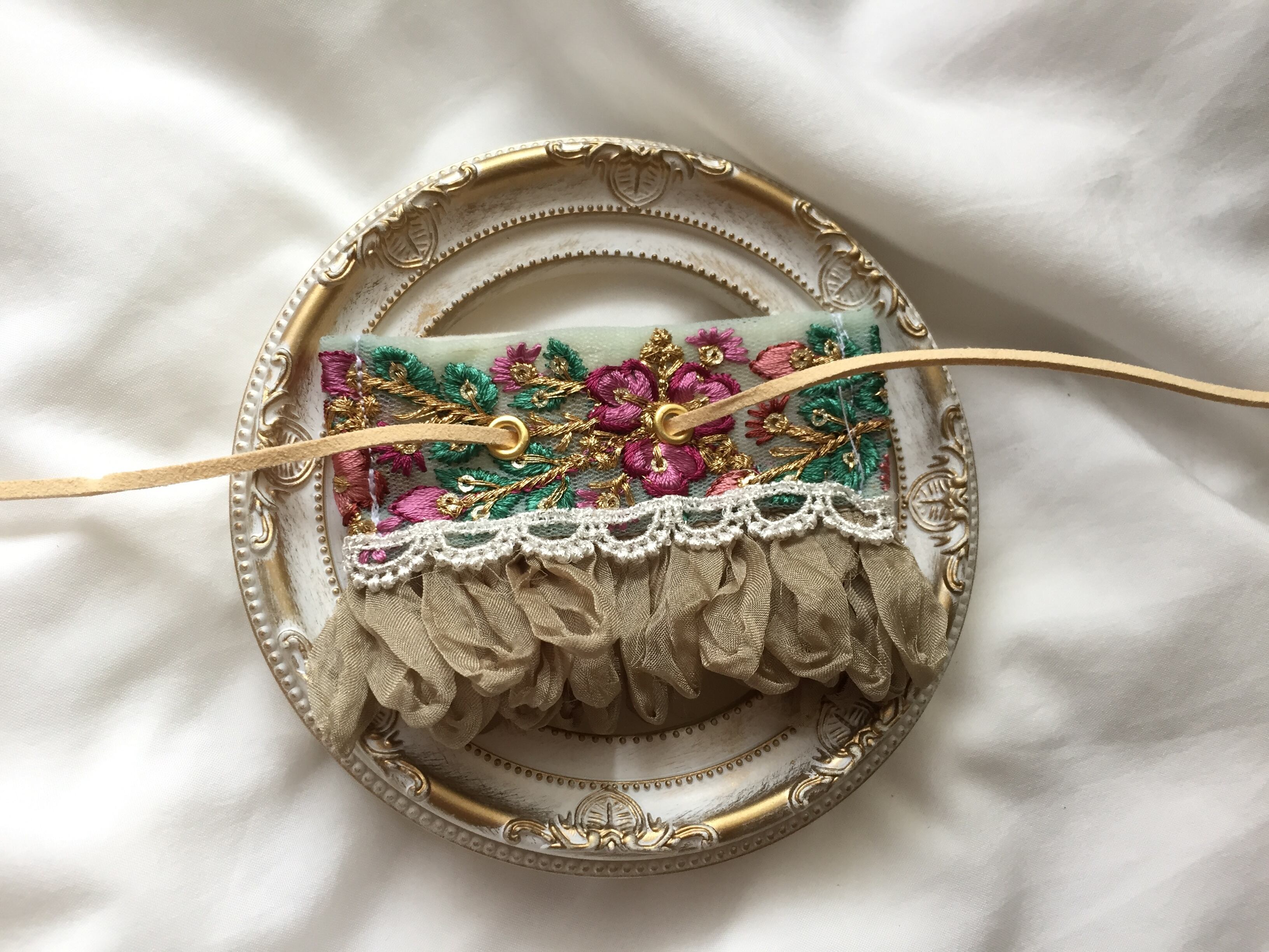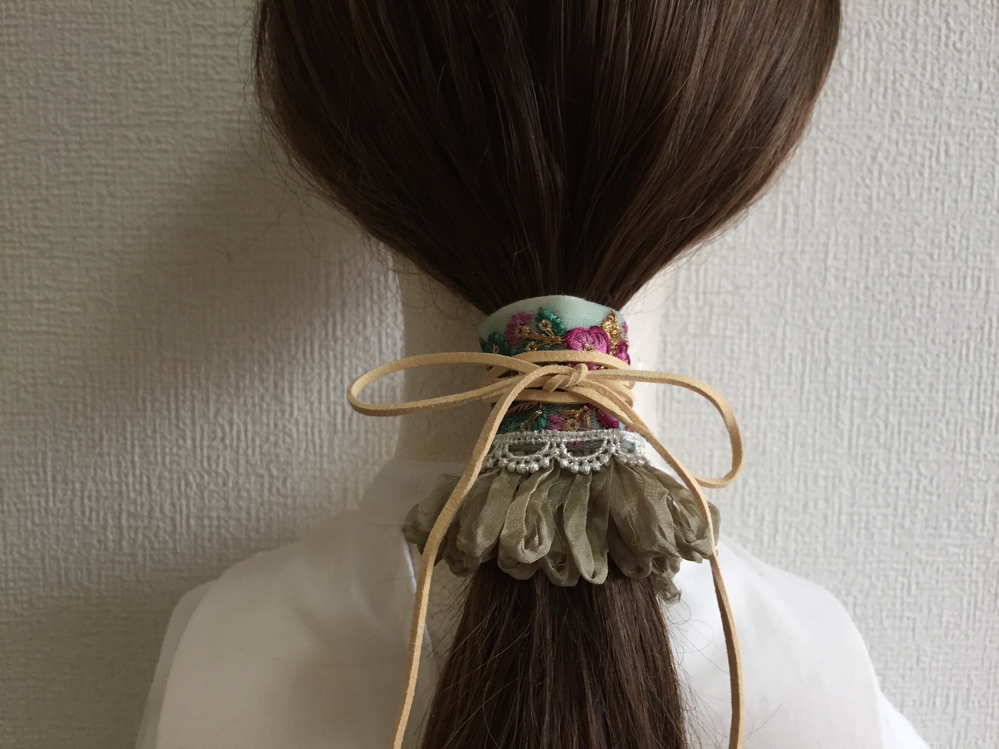 インド刺繍リボンを使った2種類のレースが可愛いラップリボンのヘアアクセサリーです。