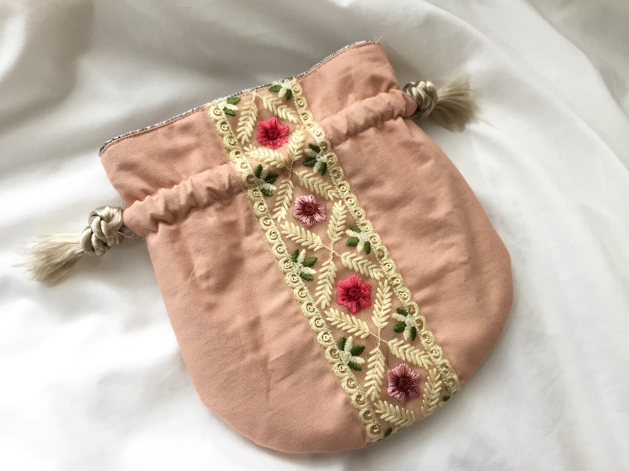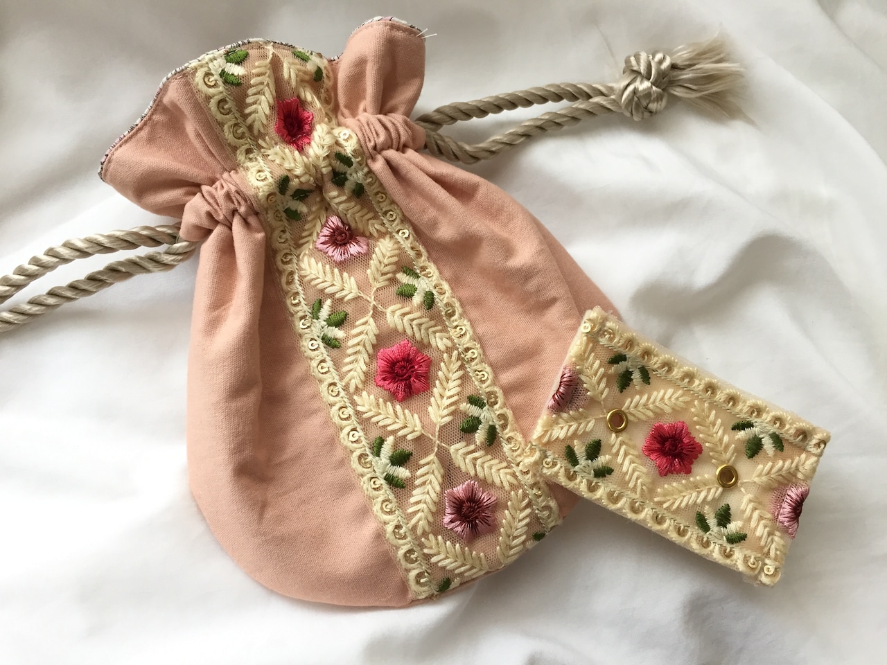 インド刺繍リボンを使用した、まんまるとした丸巾着ポーチです。小物を入れる事ができます。