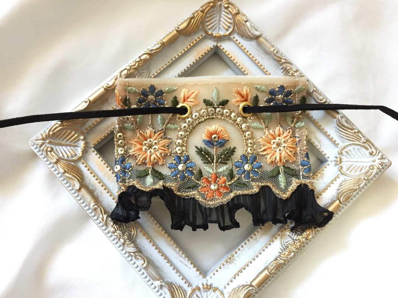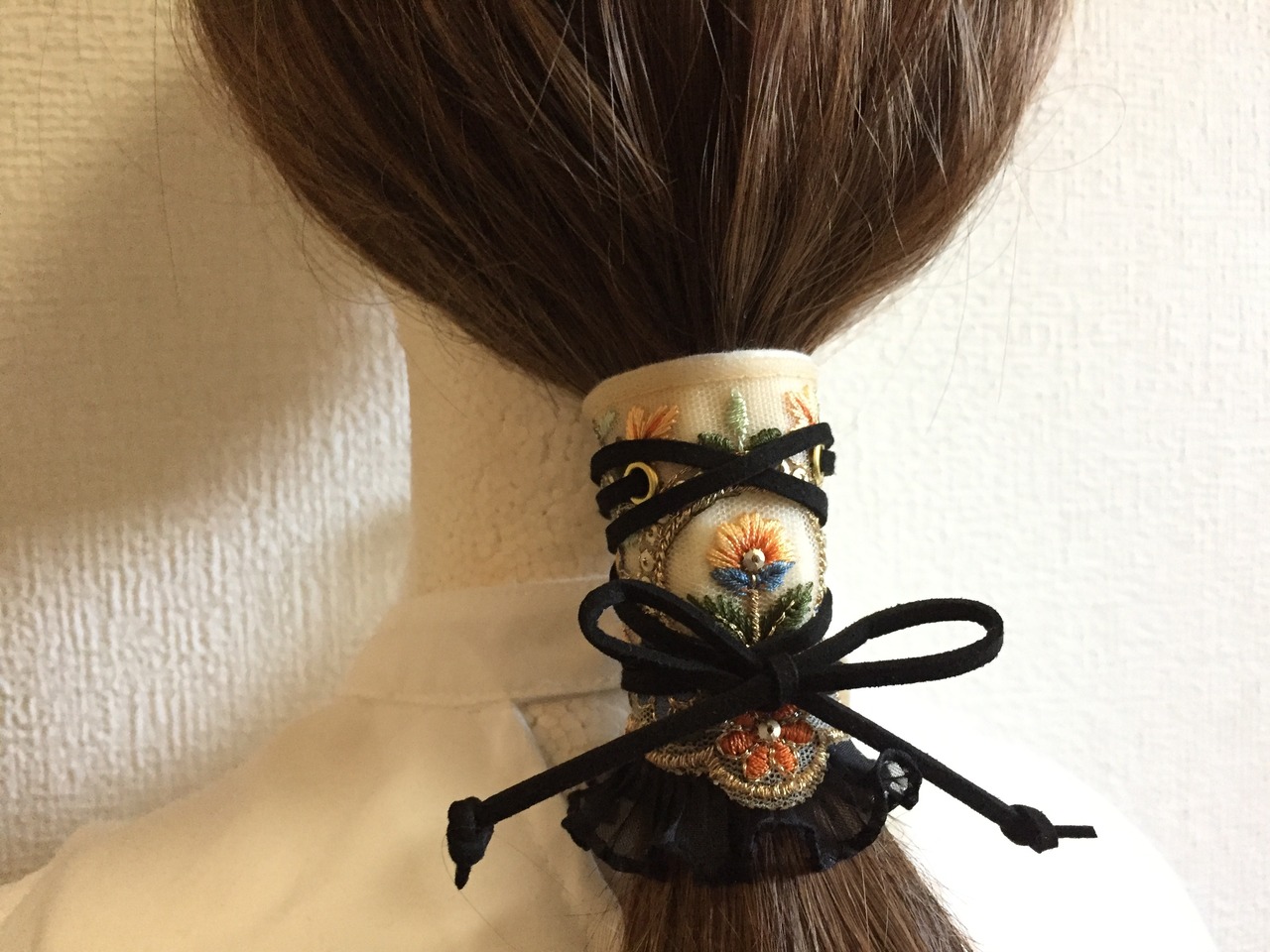 インド刺繍リボンとフリルレースを使用した可愛いポニーフックのヘアアクセサリーです。