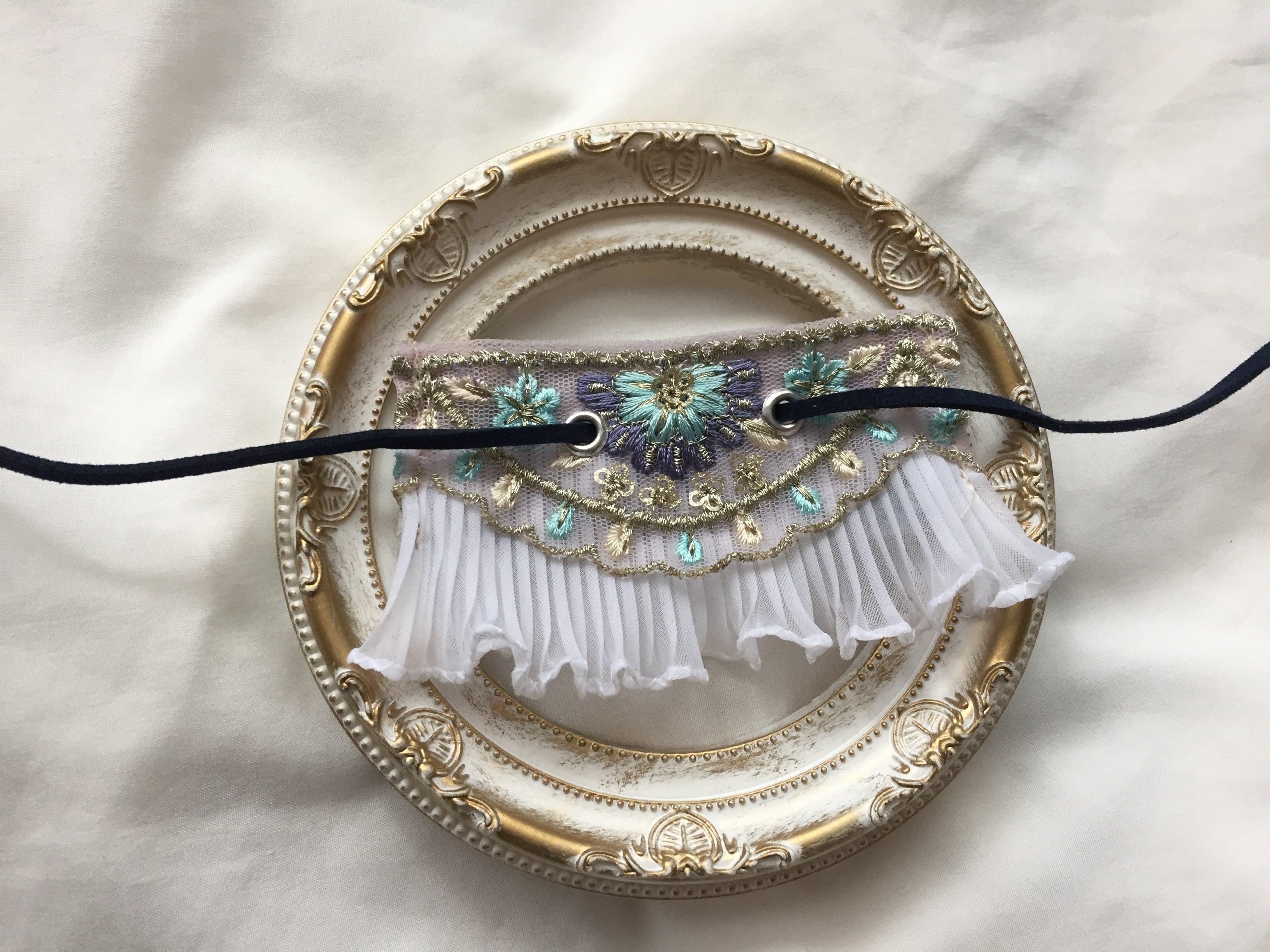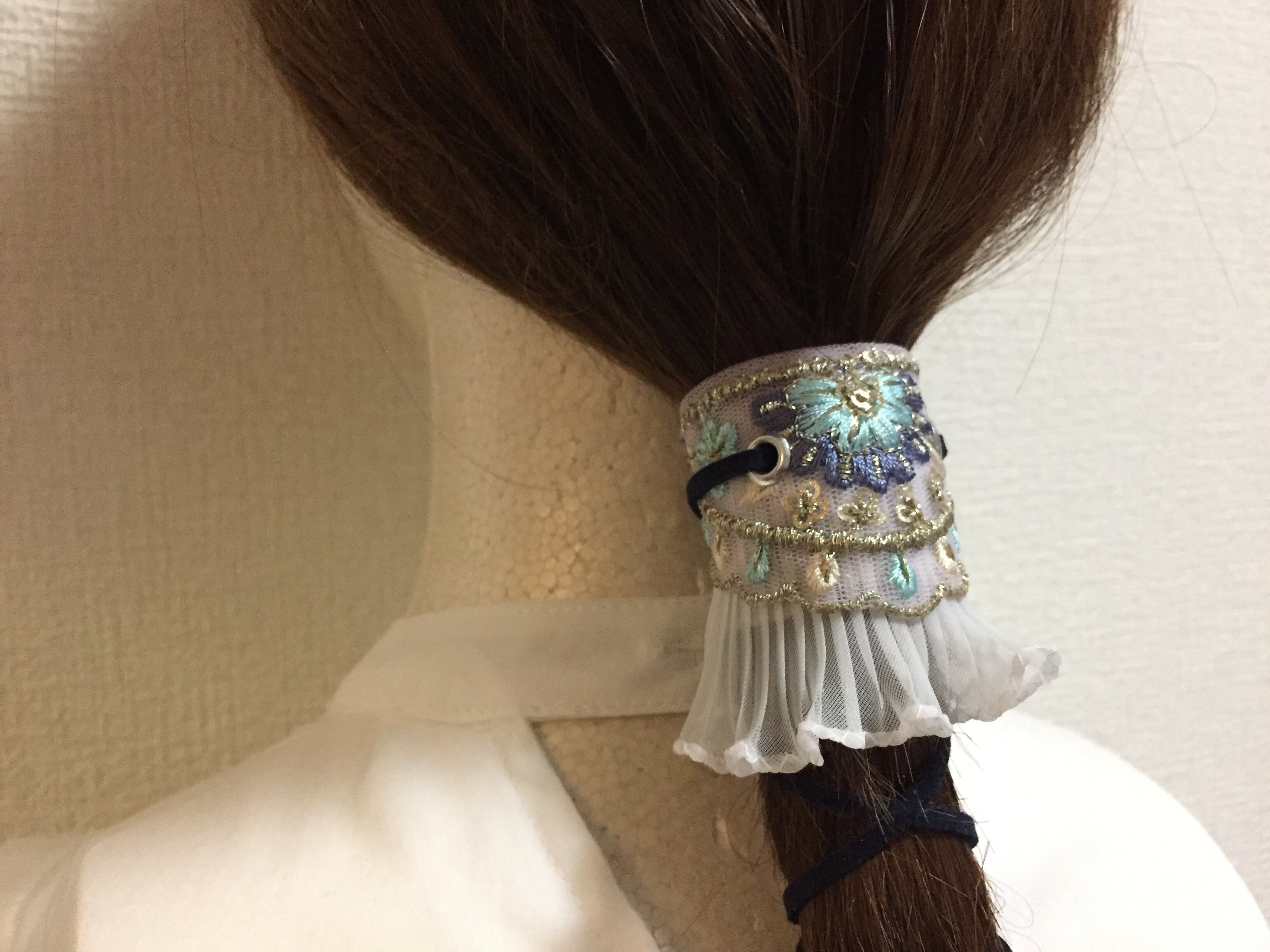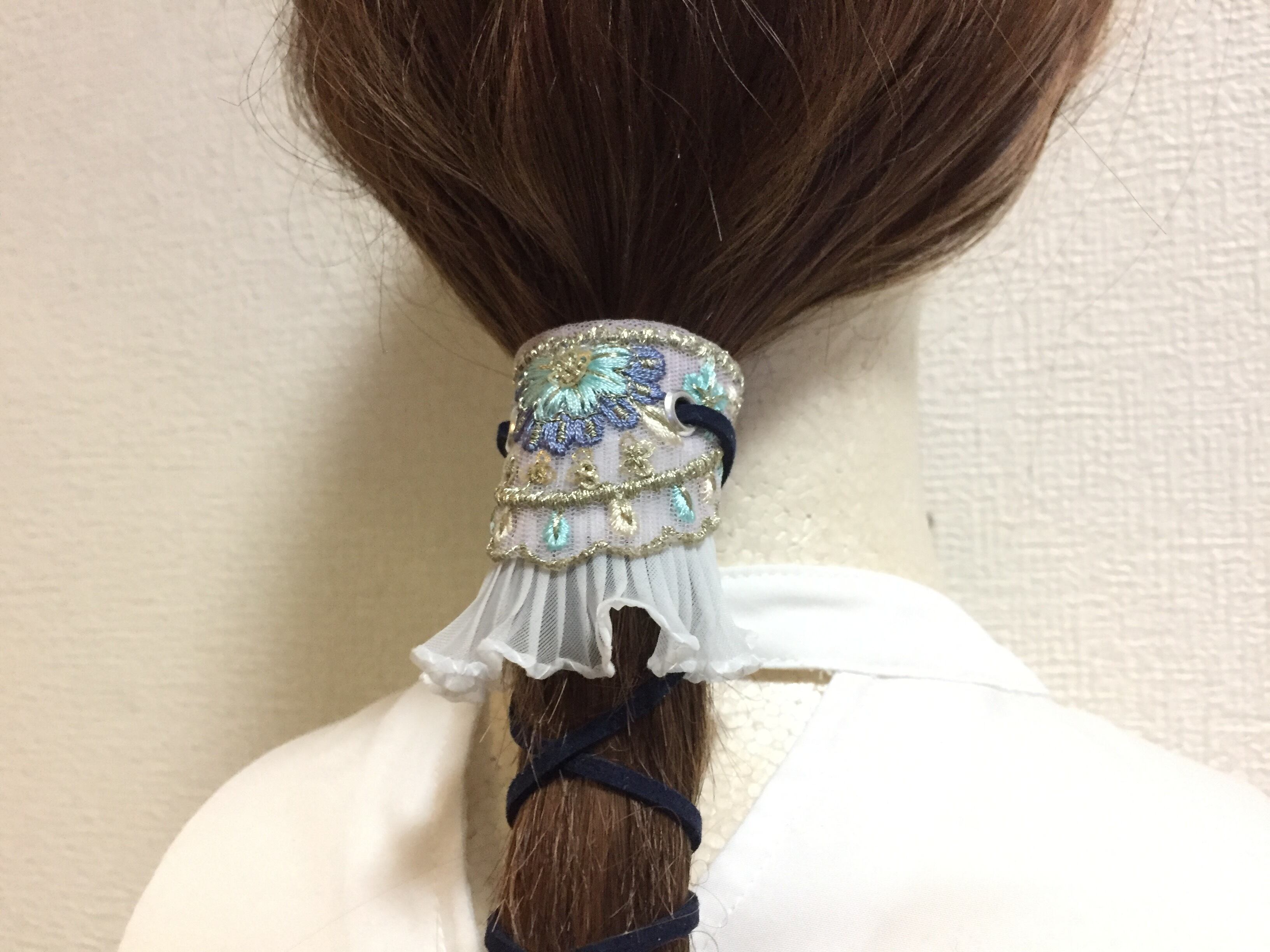 インド刺繍 リボン ポニーフック ラップリボン リボンラップ ブルー花柄×レース