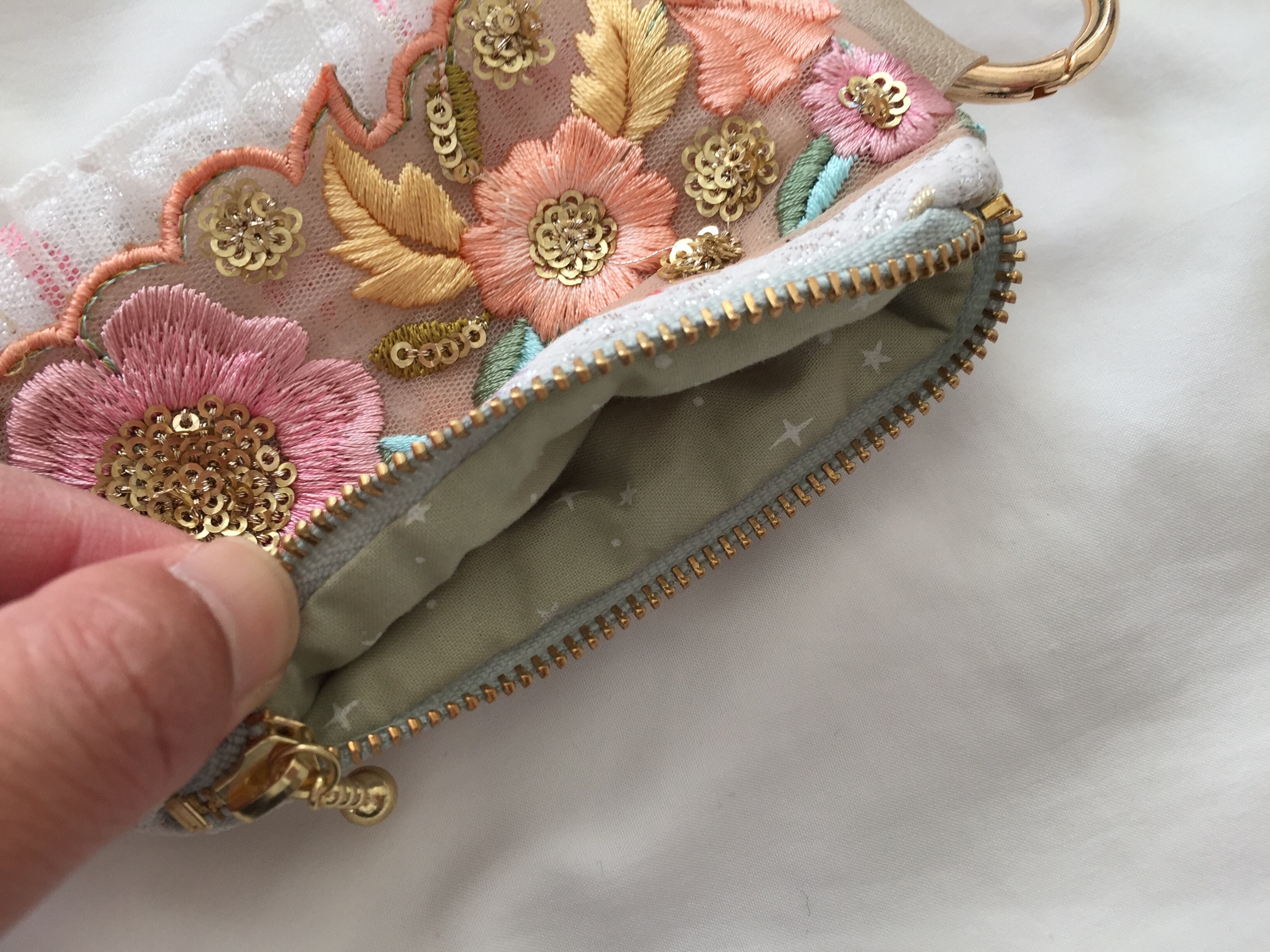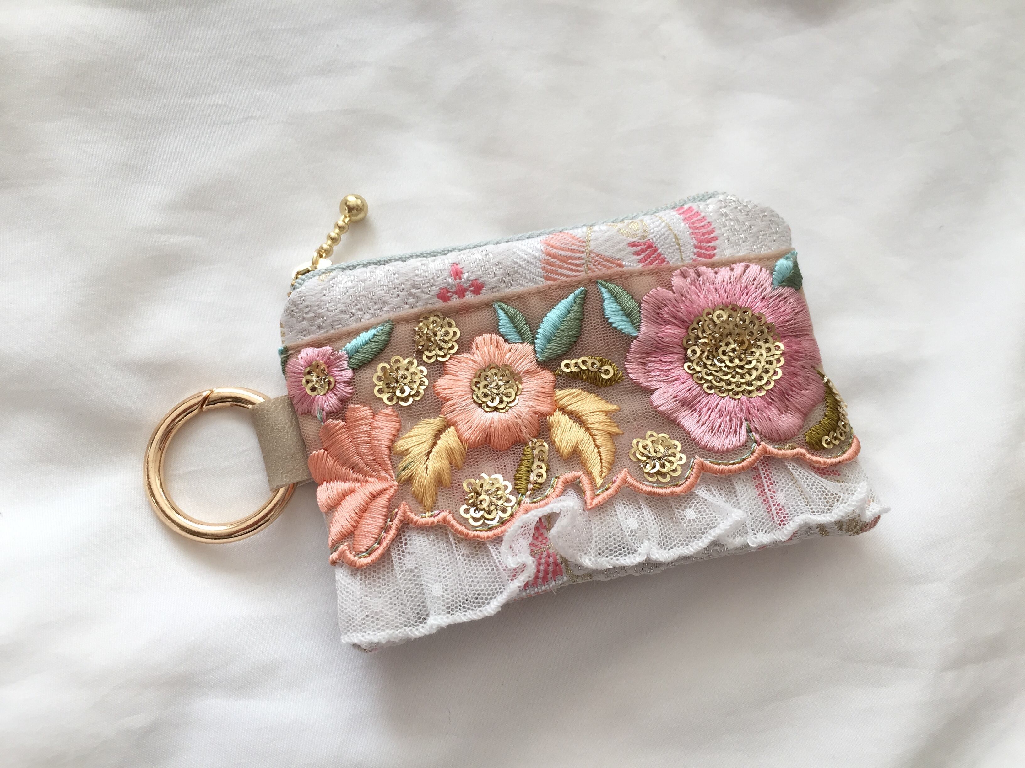 インド刺繍 リボン ファスナーポーチ カラビナ付き ピンク