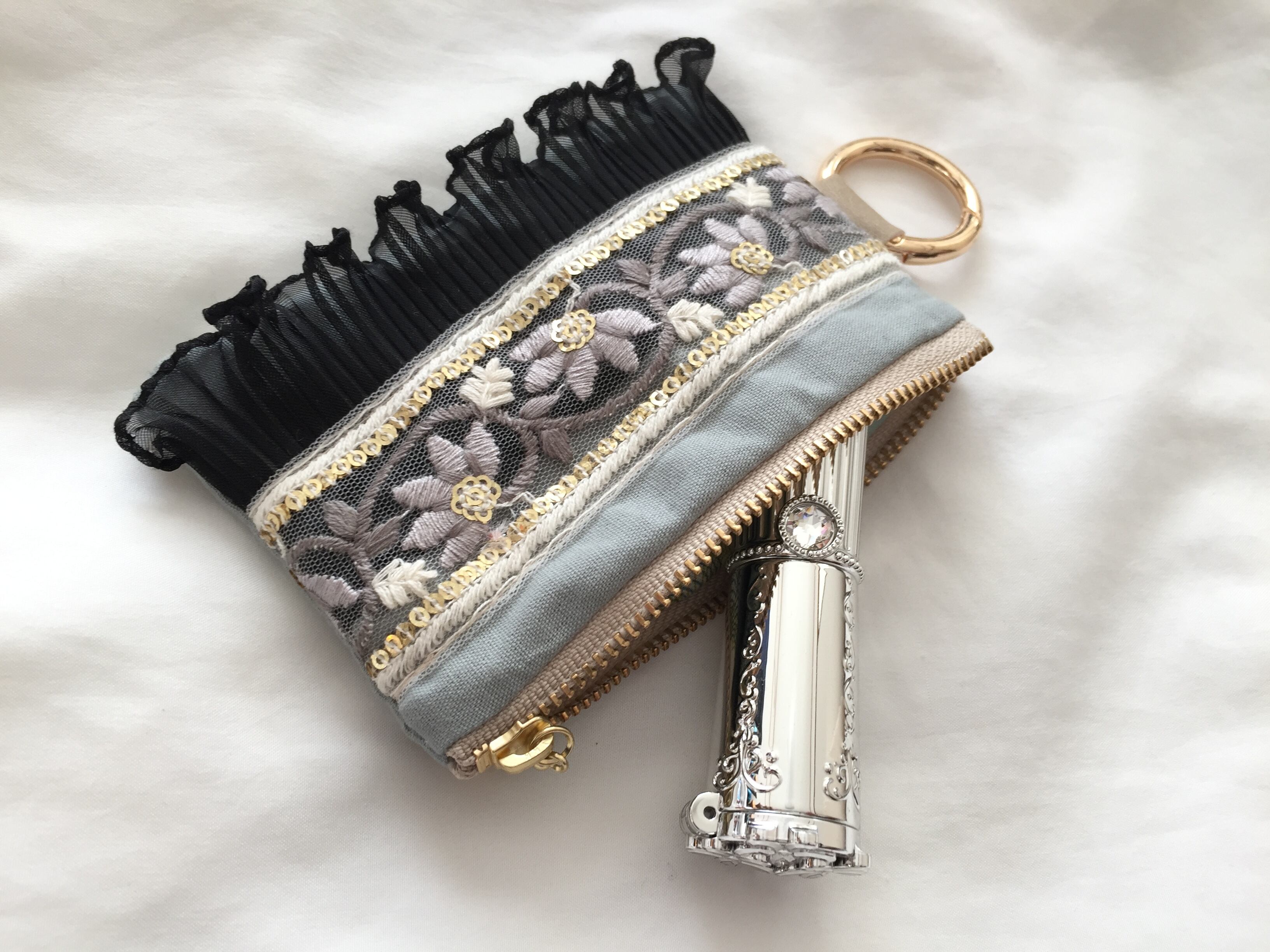 インド刺繍 リボン ファスナーポーチ カラビナ付き