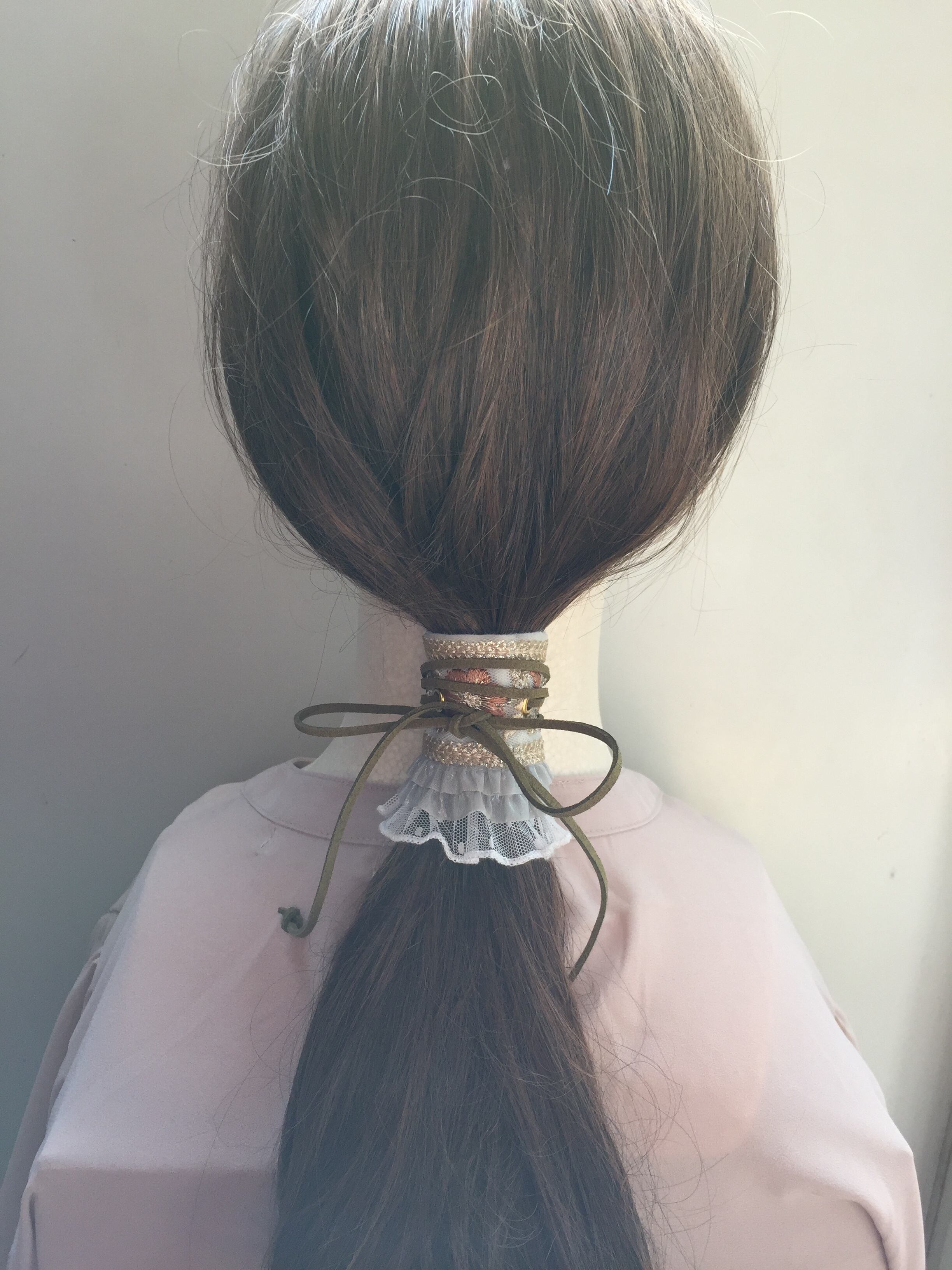 使い方は、お持ちのヘアゴムを結んだ後、ヘアゴムの結び目にポニーフックを差し込んで紐を結ぶだけです。